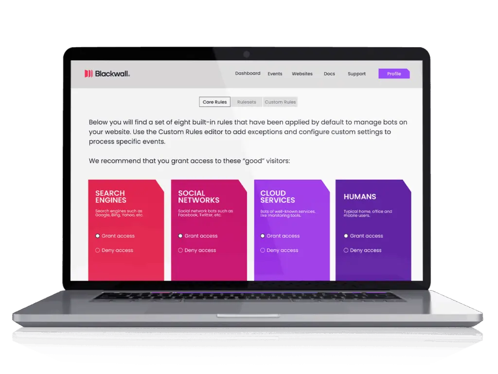 Blackwall is een toonaangevende oplossing voor het beveiligen en beheren van webverkeer. Met name geschikt voor webhosting- en clouddiensten, beschermt Blackwall uw infrastructuur tegen kwaadaardige bots, scraper-activiteiten, DDoS-aanvallen en andere bedreigingen.